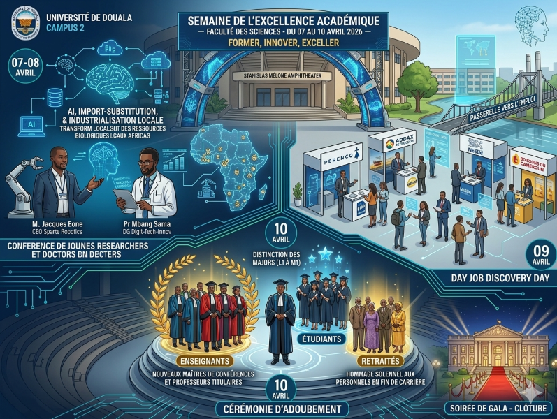 Du 07 au 10 avril 2026, le Campus 2 de l’Université de Douala, et plus particulièrement l’amphi Stanislas Mélone, devient l’épicentre de l’innovation technologique et de la reconnaissance académique. Sous la bannière de la Semaine de l’Excellence Académique, la Faculté des Sciences déploie un programme ambitieux tourné vers un objectif clair : former, innover et exceller.